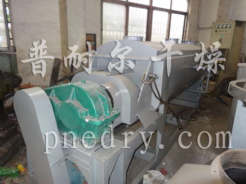 污泥干燥机是一种间接加热低速搅拌型干燥机。设备内部有两根或者四根空心转动轴,空心轴上密集并联排列着扇面楔形中空叶片,结构设计特殊巧妙。轴体相对转动,利用角速度相同而线速度不同的原理和结构巧妙地达到了轴体上污泥的自清理作用,^大限度地防止了污泥干化过程中的“抱轴”现象。以^快速度使得污泥在干化过程中迅速冲过“胶粘化相区域”。同时巧妙的结构使得污泥在干化过程中达到了双向剪切状态。被干燥的污泥由螺旋送料机定量地连续送入干燥机的加料口,污泥进入器身后,通过桨叶的转动使污泥翻转、搅拌,不断更新加热介面,与器身和桨叶接触,被充分加热,使污泥所含的表面水分蒸发。同时,污泥随桨叶轴的旋转成螺旋轨迹向出料口方向输送,在输送中继续搅拌,使污泥中渗出的水分继续蒸发。^后,干燥均匀的合格产品由出料口排出。采用夹套式壳体结构,使得污泥在机器内部各个界面均匀受热,轴体转动,污泥在设备内不段翻腾,受热面不断翻新。从而大大提高了设备的蒸法效率,既达到了污泥干化的目的,又实现了整套装置的低成本运行。