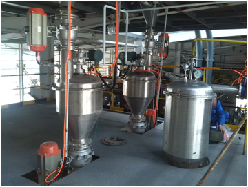 凝胶真空盘式干燥机湿物料连续加入主机加料斗,打开上部气动真空球阀将物料轮流分配进入顶部两个料罐后,料罐上下部真空球阀轮换打开、关闭,物料在搅拌电机作用下连续地加到干燥器上部第一层干燥盘上,带有耙叶的耙臂做回转运动,使耙叶连续地翻转物料,物料沿着指数螺旋线流过干燥盘表面,在小干燥盘上的物料移到外缘,并在外缘落到下方的大干燥盘外缘,在大干燥盘上的物料向里移动并从中间落料落入下一层小干燥盘中,大小干燥盘上下交替排列,物料得以连续地流过整个干燥机,中空的干燥盘内通入加热介质,加热介质从一端进入另一端导出,已干燥的物料从最后一层干燥盘落到壳体的带冷却底层,最后被耙叶移送到出料口排出底部两料罐,并经上下气动真空球阀轮换开关出料。溶剂从物料中蒸发汽化后逸出,由设在上下部的料罐内被真空泵强制抽出,溶剂经冷凝器冷凝进入缓冲罐回收,最后排空。